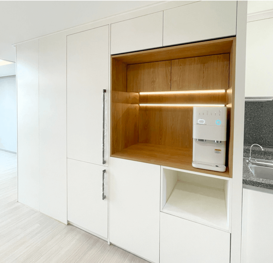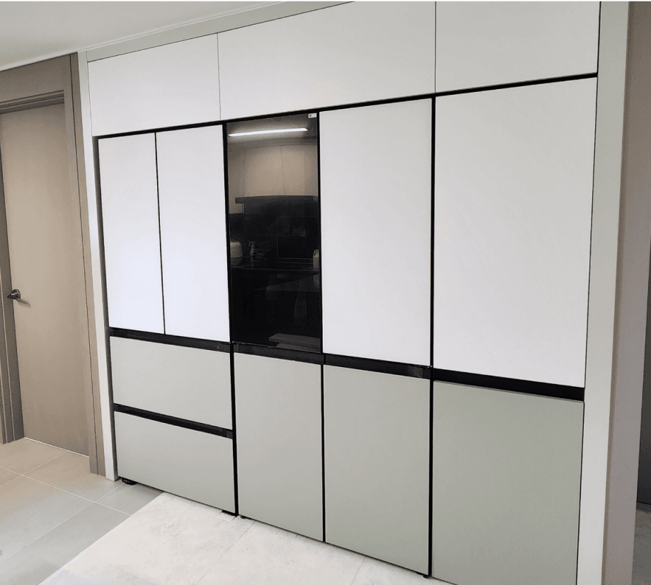 이 과정에서 많은 것들을 결정하셔야 하는데요. 냉장고장의 컬러와 내 냉장고의 컬러는 잘 맞는지, 냉장고가 들어가는 윗부분의 상부장 라인은 내 냉장고에 맞출 것인지, 양 옆에 남는 공간은 홈바장으로 꾸밀 것인지, 밥솥장을 넣는 공간으로 할 것인지, 아니면 공간이 넉넉하지 않아 키큰장을 사이드에 둘 것인지 등 말이죠.