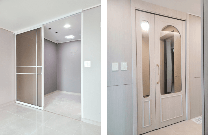 점점 더 많은 분들이 중문은 본래의 단열 효과뿐 아니라 사생활 보호를 위해서 설치하기 시작했어요. 각종 생활소음이 우리 집 바깥으로 빠져나가지 않게 하기 위함이었죠.