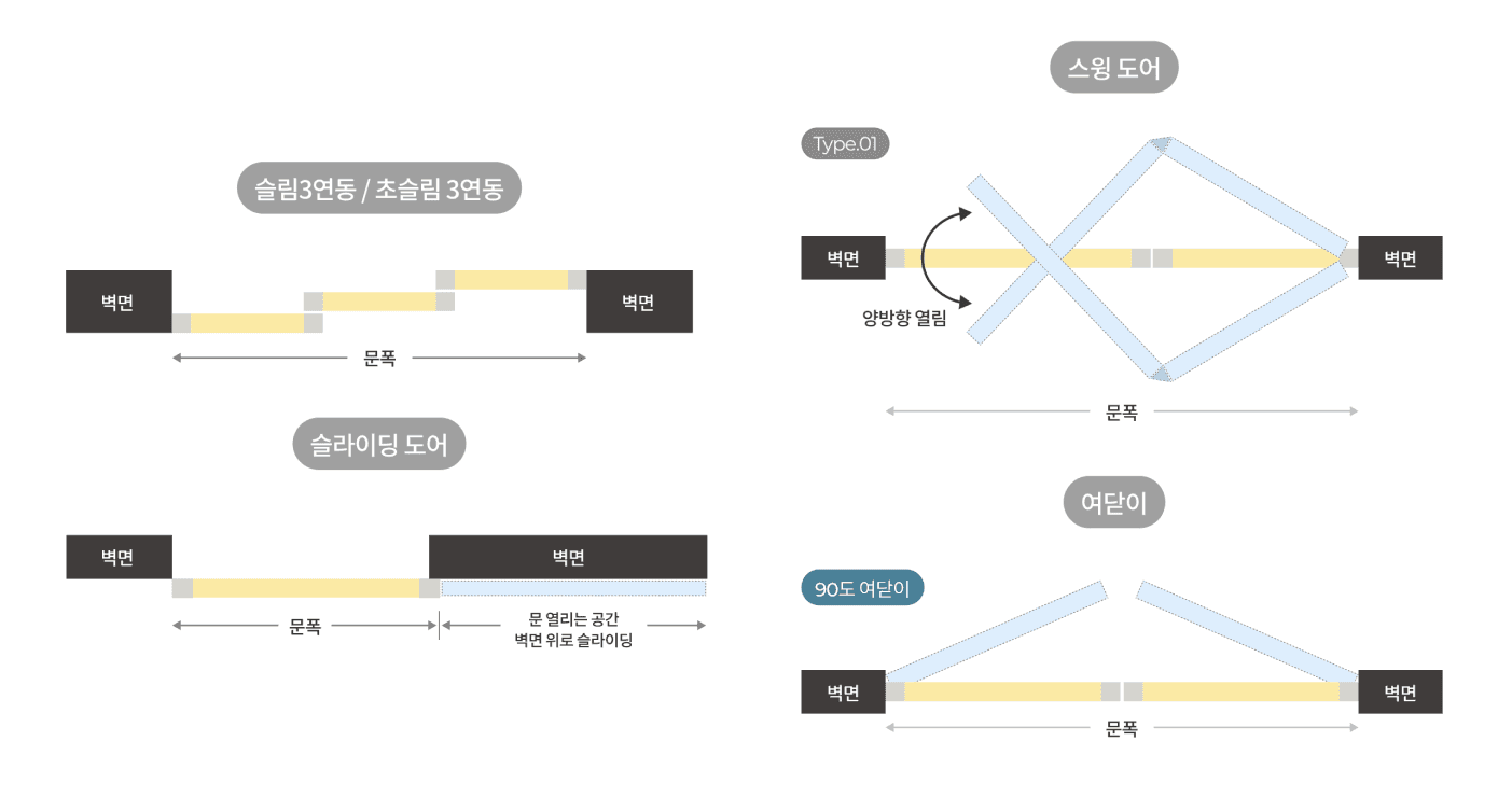 일단 타입만 봐도 슬림3연동(초슬림3연동), 여닫이, 스윙, 원도어 슬라이드, 포켓 등이 있는데요. 너무 복잡하죠?